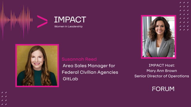 In the latest episode of IMPACT Women in Leadership, host Mary Ann Brown sits down with Susannah Reed, Area Sales Manager for Federal Civilian Agencies at GitLab. With over 15 years of experience helping federal agencies navigate digital transformations and implement DevSecOps practices, Susannah brings valuable insights into leadership, growth, and innovation in the tech space.